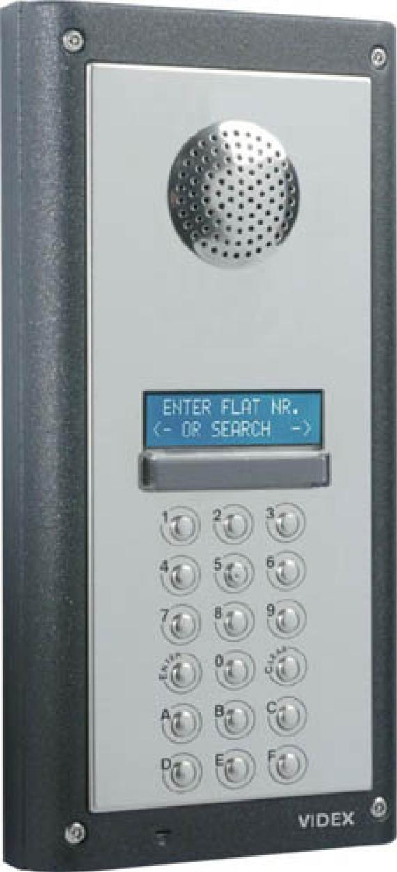 Surface 4000 series stainless steel facia with gun metal grey housing audio digital door panel. The VX2200 audio system is based on a  BUS for audio systems and a BUS for video systems. Complete with a 2 line 16 character LCD display and voice annunciation for call progressing information. Up to 998 apartments can be called from this panel and up to 998 access codes can be stored.