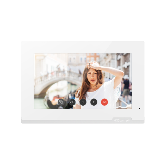 Colour monitor Venice for ViP system with 7" capacitive touch screen, resolution 1024x600, full-duplex hands-free audio and SPOE power supply. Allows adjustment of the colour level, contrast, audio and ringtone volume. It is possible to customize the ringtone by choosing between different melodies. Equipped as standard with door release functions, audio enable / disable button, self-ignition, privacy service and other programmable functions. Manages landing calls and call repetition as standard. Compatible with H.264 video format. Dimensions (L x H x D): 194x130 x15.9mm.