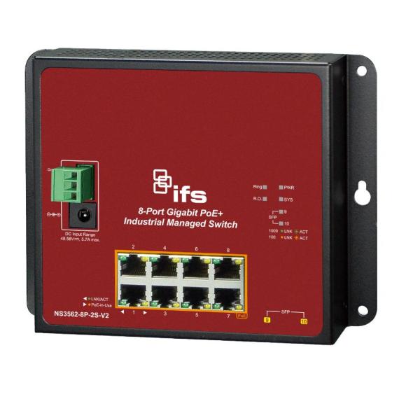 | Datasheet for Aritech, NS3562-8P-2S-V2, INDUSTRIAL 8-PORT 10/100/1000T 802.3AT POE PLUS 2-PORT 100/1000X SFP WALL-MOUNT MANAGED SWITCH | Download |