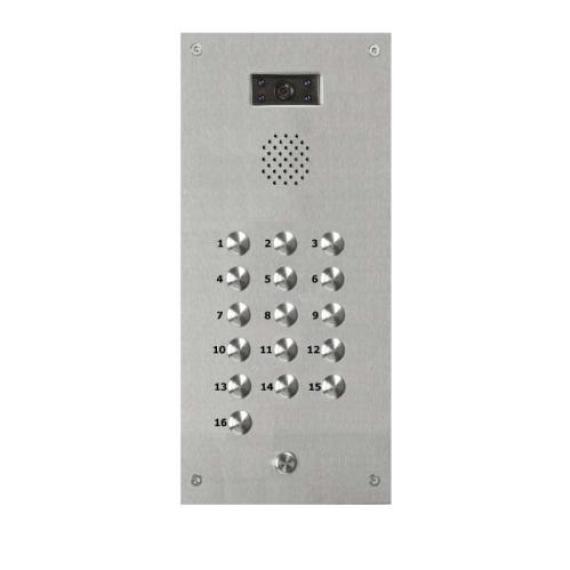 This sixteen button vandal resistant panel is manufactured from 2.5 mm 316 marine grade stainless steel. The panel comes with a zintec back box which is used for a flush mount installation.