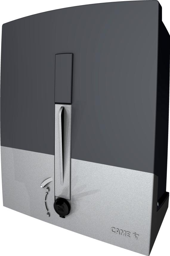 Automation with 24 V motor, complete with electronic board with dip switch settings, built-in radio decoding, movement management and obstacle detection for sliding gates up to 400 kg and 10 m in length. RAL7024 gray cover.