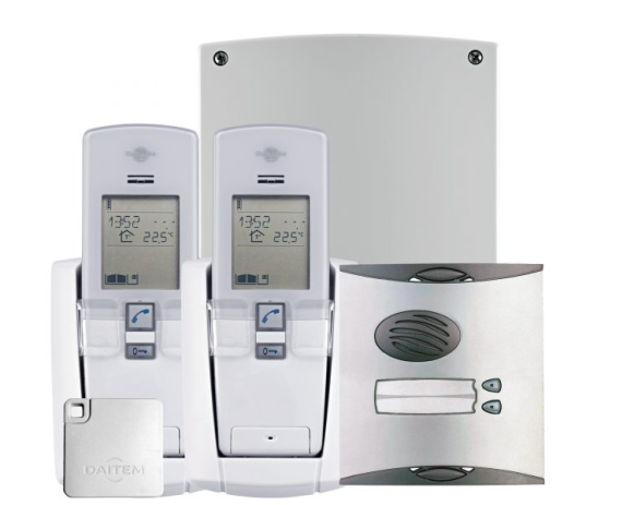 This is the new Daitem 2 way intercom kit No keypad. Comprises low voltage powered controller unit, 2 button caller unit and prox reader, Anti vandal cover and 2 x SC100AU mains charged Handsets included.